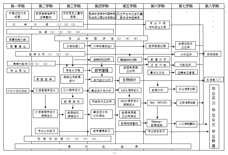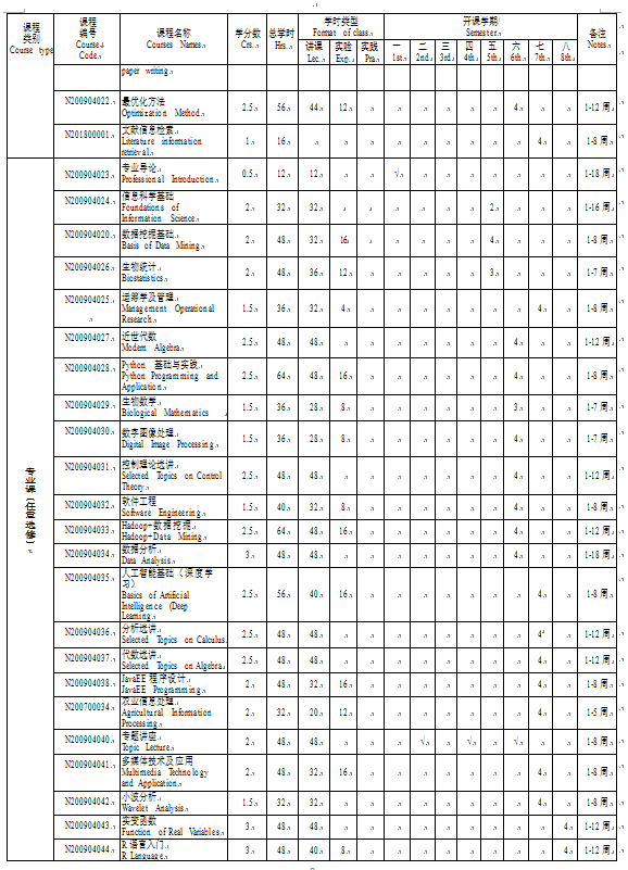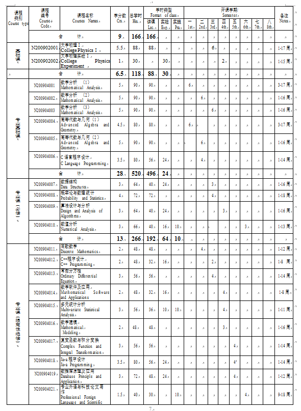 数学分析、高等代数与几何、概率论与数理统计、数值分析、数学建模、多元统计分析、C语言程序设计、算法设计与分析、JAVA程序设计。