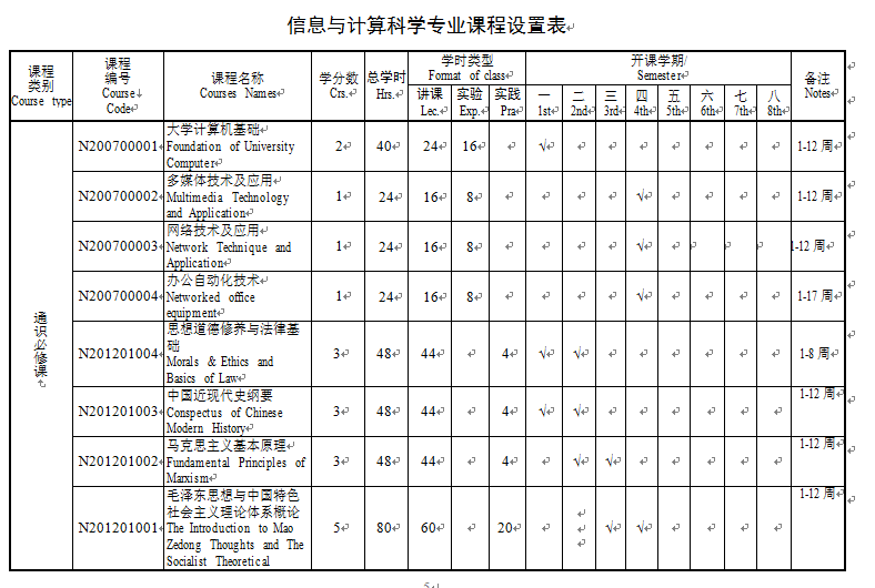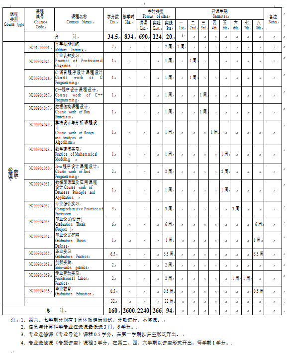 实践环节包括课程设计、专业综合实习、毕业设计(论文)、毕业实习等,一般安排32周左右。主要专业实验有C语言程序设计、数据结构、算法设计与分析、数学软件及应用、数值分析、多元统计分析、最优化方法、数据库原理及应用、Java程序设计等课程的实验。