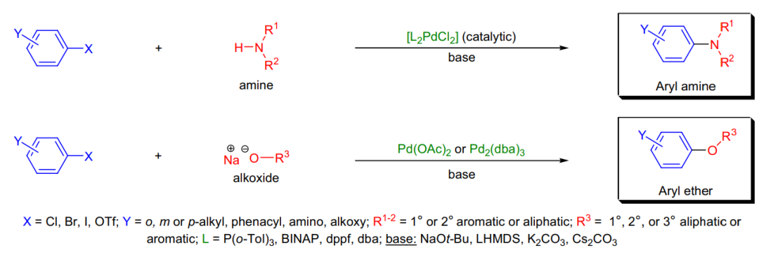 Buchwald–Hartwig反应,钯催化下芳基卤代物或芳基磺酸酯和胺或酰胺偶联制备芳胺或酰基芳胺的反应。