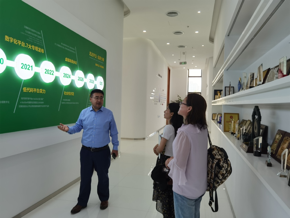 每到一家企业两位老师都受到了热烈欢迎,通过座谈交流环节,周主任介绍了信计专业办学历史、人才培养、专任教师的教科研和近几年招生、毕业生考研就业等基本情况及取得的成绩,表明通过“访企拓岗促就业”专项行动对于提升人才培养质量、提高就业质量、推动校企深度合作的重要意义。公司负责人介绍了公司发展历程、产业布局、市场前景、就业需求和企业文化,并通过参观人工智能展厅、荣誉墙、观摩各高校学生实训现场等,了解公司业务对接的具体行业企业等,切身感受企业生产、工作和生活环境。企业负责人表示,企业的发展需要优秀的人才做支撑,学校的人才培养与企业高度契合,希望企业和学校能够继续在科技创新、成果转化、人才招聘等方面加强交流与合作,为企业发展注入新动力。校企双方就实习实践、技术攻关、人才培养模式、校企合作领域等进行了深入交流。希望进一步加强沟通协作,在人才培养、实习实践基地建设、实训效果、就业质量和就业创业等方面开展更加深入的交流合作。