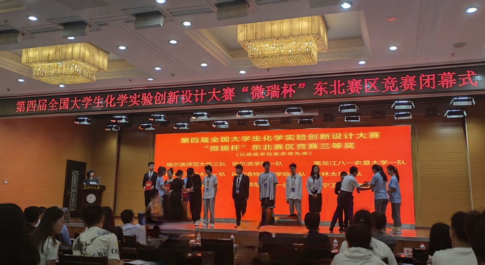 2023年7月4日-7月6日,第四届全国大学生化学实验创新设计大赛“微瑞杯”东北赛区竞赛在黑龙江大学举办,77779193永利官网曹丽丽、丁冬雪两位老师指导的2021级应用化学专业李天明、张旭、李哲3名同学组成的“胶兵必败” 科普实验组,经过两天的紧张激烈竞赛,获得了东北赛区竞赛三等奖。
