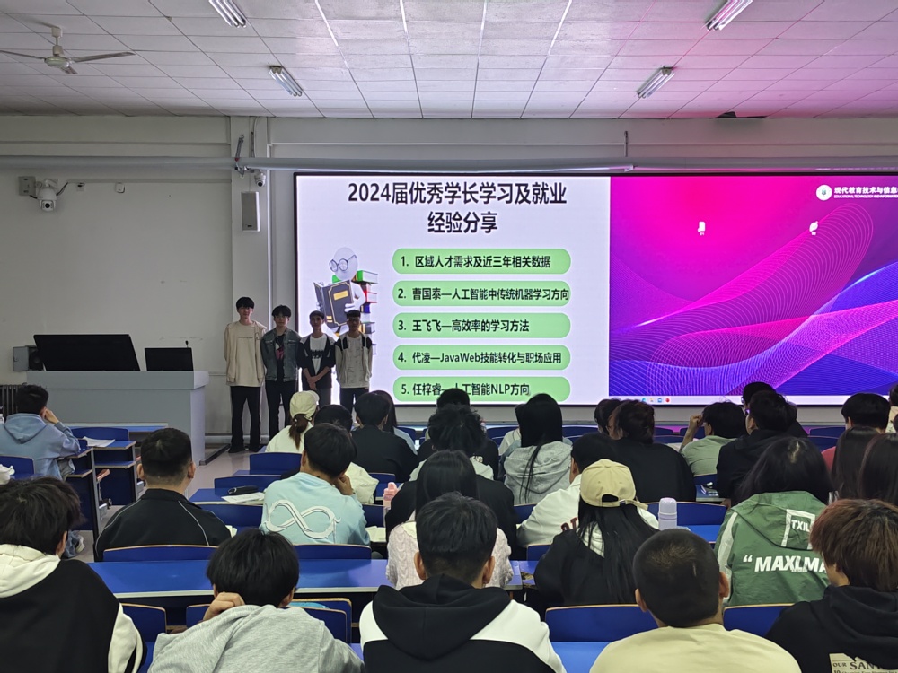 接下来,4个学长分别以主题为“人工智能中传统机器学习方向”、“JavaWeb技能转化与职场应用”、“人工智能自然语言处理方向”、 “高效率的学习方法与高质量的就业”等,从在校课程学习方法、实习体验、应聘技巧、工作经历等方面给学弟学妹们分享了自己的切实体会。通过讲座,加深了同学们对专业的认识,使大家了解了专业优势,哪些课程对自己就业岗位高度相关,哪些活动对应聘成功发挥了核心作用,同时告诫学弟学妹们要珍惜在校时间,及早做好职业规划,制定完整的学习路线,坚持每天完成制定的学习任务,充分利用丰富的网络资源,提高学习效率,通过特定项目的练习,巩固所学知识,遇到相关问题及时与老师们交流。同学们也认识到能够找到满意的工作并且有较好的职业发展前景,需要扎实的专业基本功,出色的个人简历,切合实际的面试话术,丰富的实习实践经验的积累等。